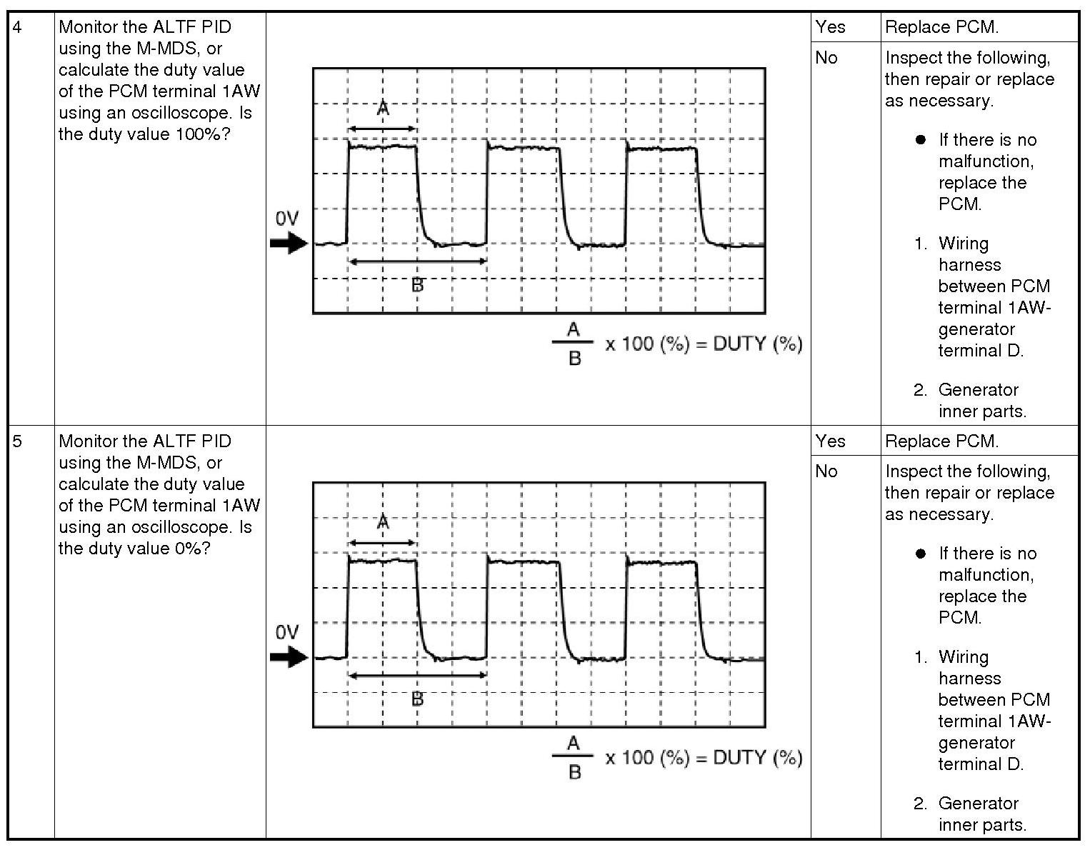 If the generator field coil duty value does not change when electrical loads (such as headlights, blower motor, rear window defroster, brake lights) are on or off, inspection with discharged battery is needed.