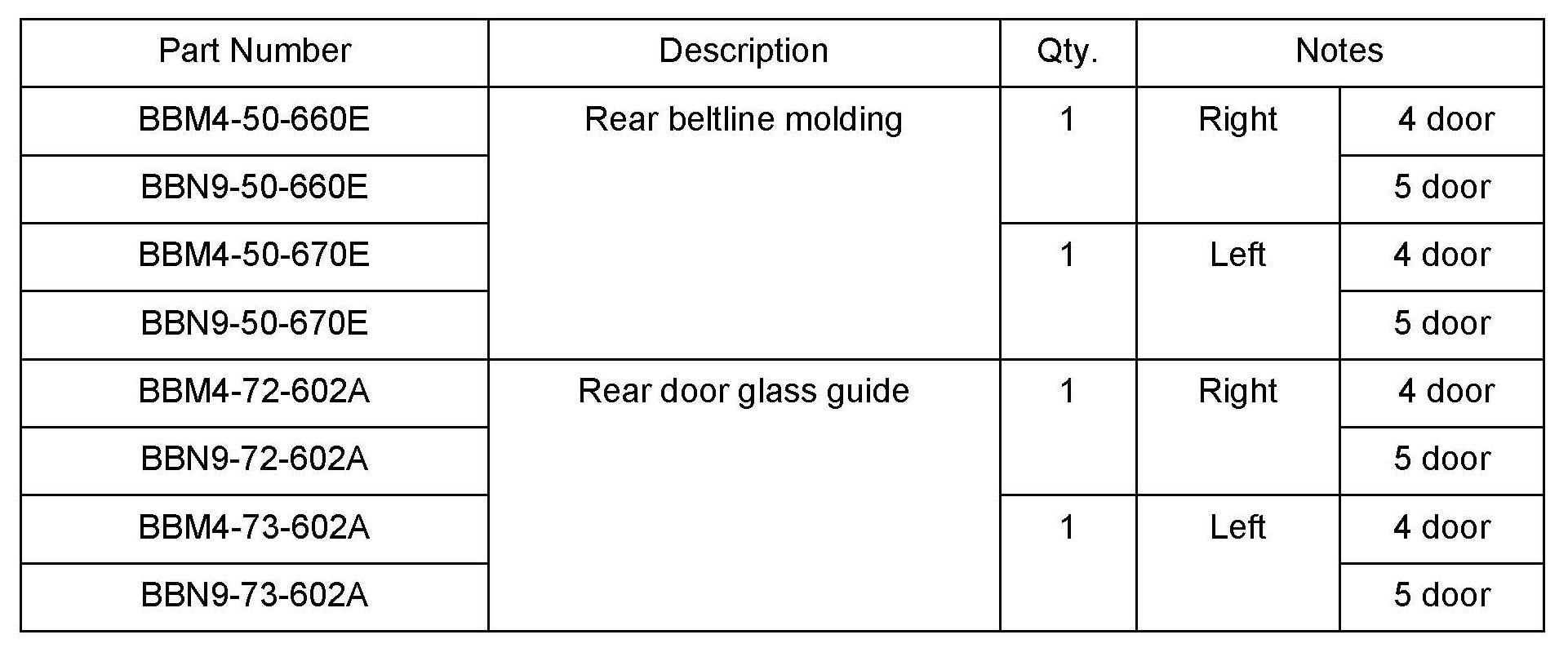 2. Replace the rear door glass guide (A) with a new one and the rear beltline molding (B) with a modified one. Refer to MS3 online instructions or Workshop Manual section 09-12 REAR DOOR GLASS REMOVAL/INSTALLATION and 09-16 REAR BELTLINE MOLDING REMOVAL/INSTALLATION.