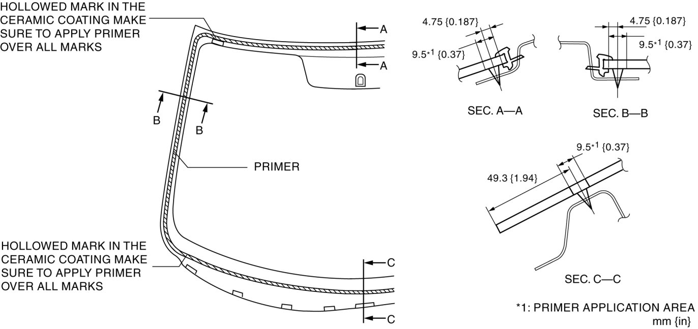 2. Clean and degrease an approx. 50 mm {2.0 in} wide strip along the perimeter of the windshield.
