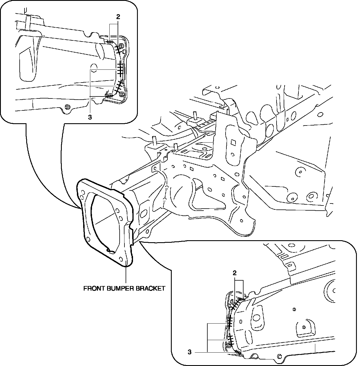 3. Continuous CO2 arc weld the 10 locations shown in the figure while install the front bumper bracket.