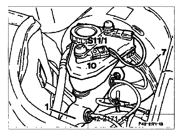 Screw cap off and drain chambers of brake fluid reservoir down to brake fluid level of approx. 10 mm. Observe Note on brake fluid