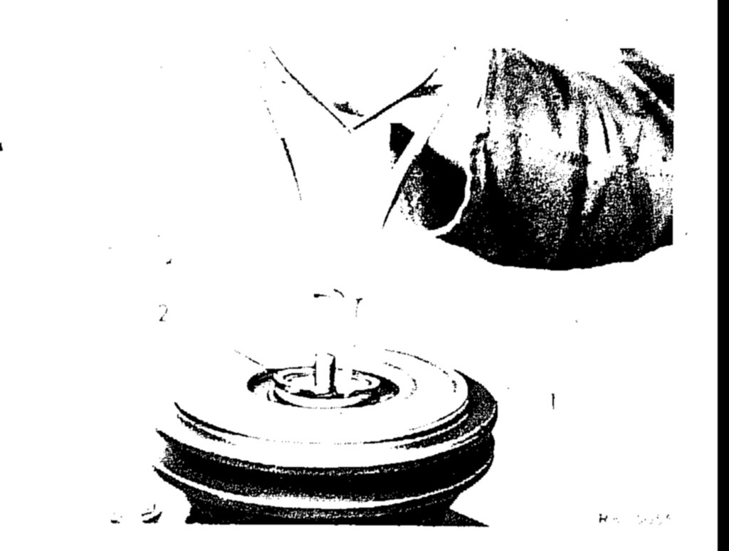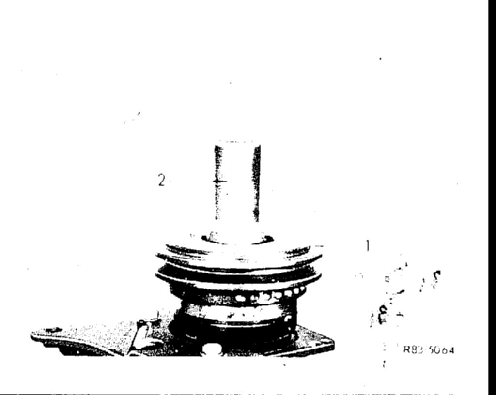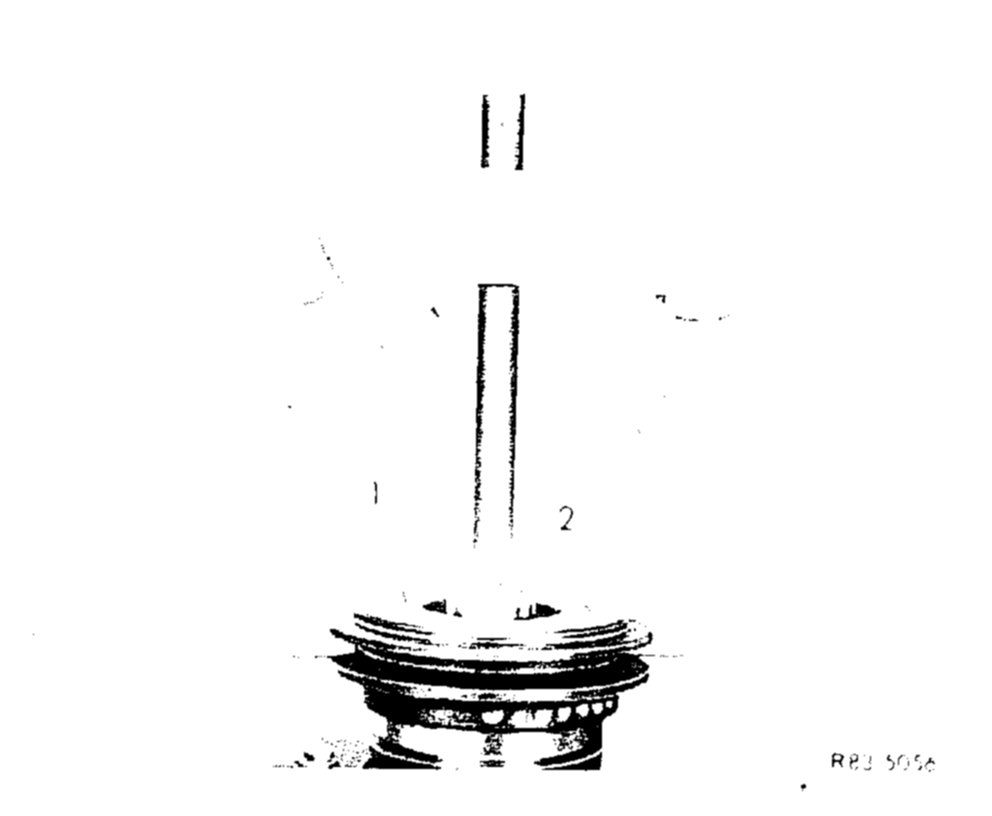 6. Knock pulley (1) with assistance of mandrel (2) on guide pin of refrigerant compressor. Position mandrel in such a manner that the respective forces are directed against inner race of bearing, so that any damage to bearing will be prevented.
