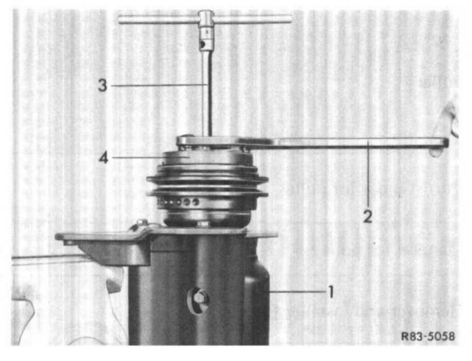 2 Prevent rotation of spring plate (4) by means of holding tool (2), unscrew collar nut from shaft using 14 mm socket.