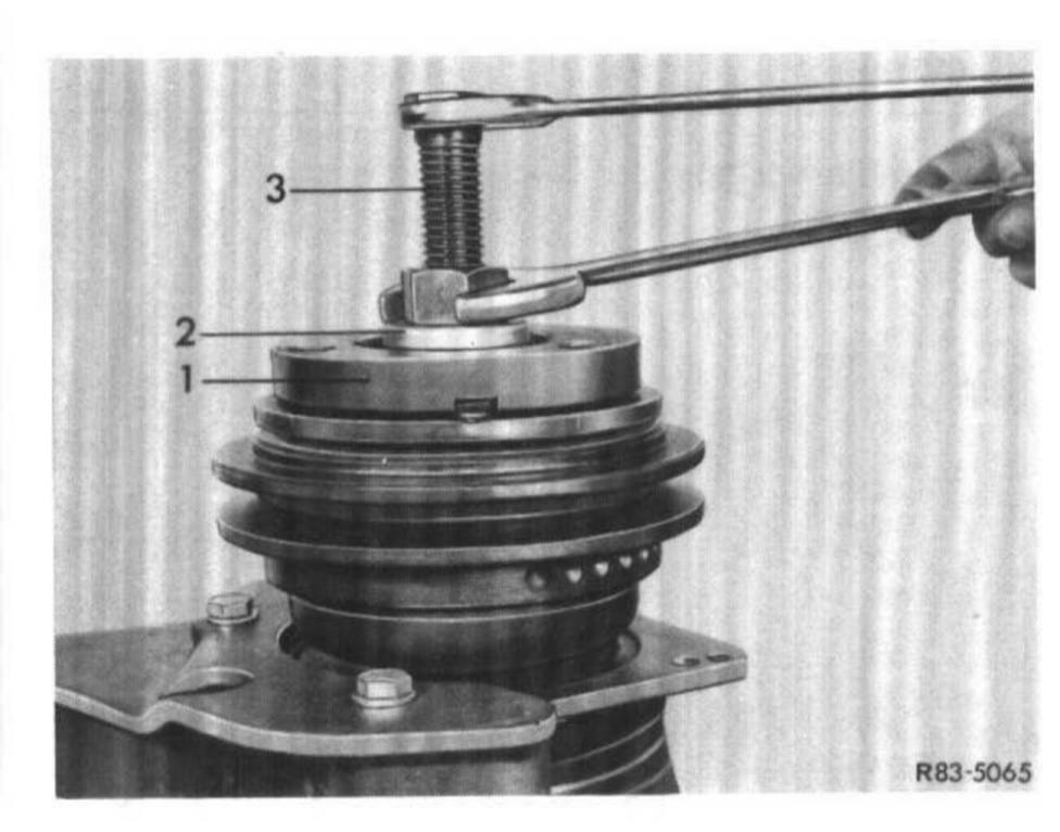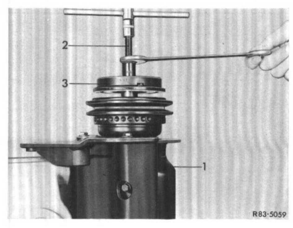 8 Place spacer (2) on spring plate (1). Insert installer (3) through spacer (2) and screw installer (3) to shaft end.