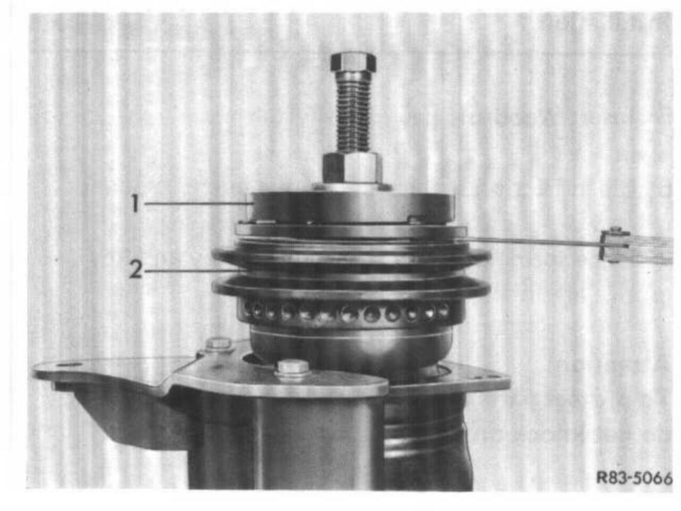 12 Screw on new collar nut. Hold spring plate in place with holding tool (2) and tighten counternut. Distance between the two friction surfaces of the pulley and the spring plate should now amount to approx. 0.5 to 1.5 mm.