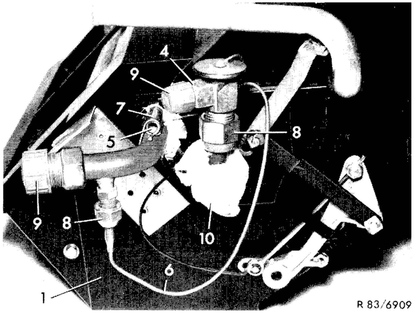 6. Unscrew pressure hose from receiver dehydrator to expansion valve on expansion valve (4).