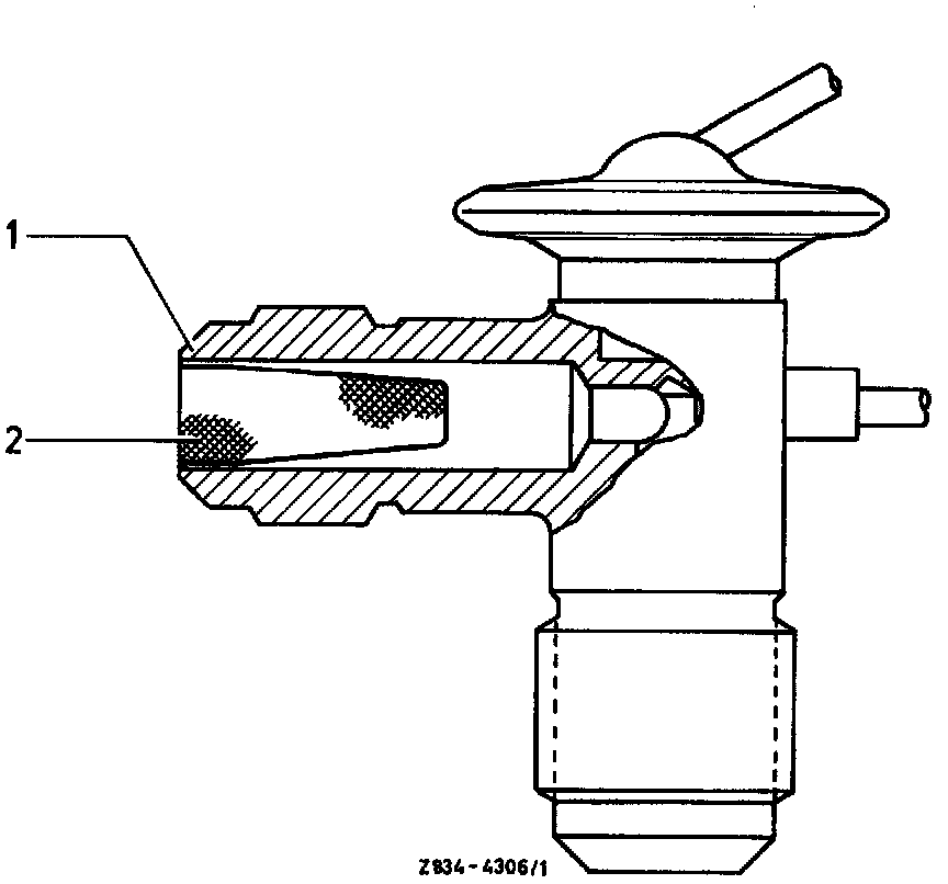 NOTE: If the strainer (2) installed in expansion valve (1) shows evidence of heavy contamination, blow out pressure line with R 12. Then clean strainer in expansion valve and renew receiver dehydrator.