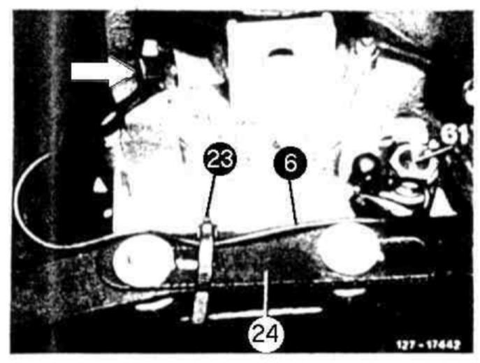 15 Loosen cable strap (23) and unscrew cable (6) on kickdown solenoid valve (61). Unscrew fastening screw for impulse transmitter (arrow) and pull out impulse transmitter.