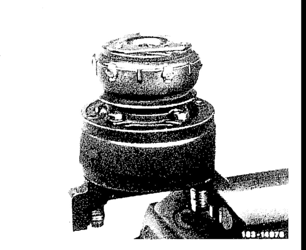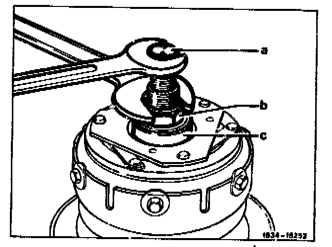 6. To install the spring plate. place bearing (c) on the spring plate. Retain belt (a) with a wrench and turn in threaded sleeve (b) until the clearance between the friction surfaces of the spring plate and the clutch body is approx. 0.5 to 1 mm.