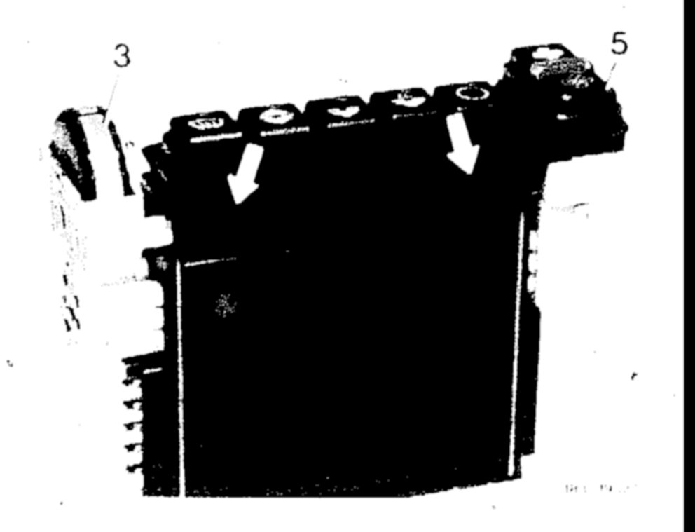 1. Pull out clip (64). Remove plastic cover (refer to arrow) from control unit, beginning at blower switch (5). 50 that pushbuttons will drop out individually.