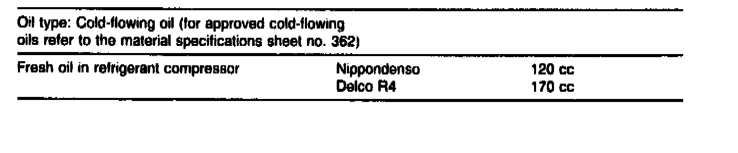 In the event of repairs to the refrigerant compressor (e.g. front shaft seal) renew receiver dehydrator and fill an additional 20 cc of fresh oil into the compressor.