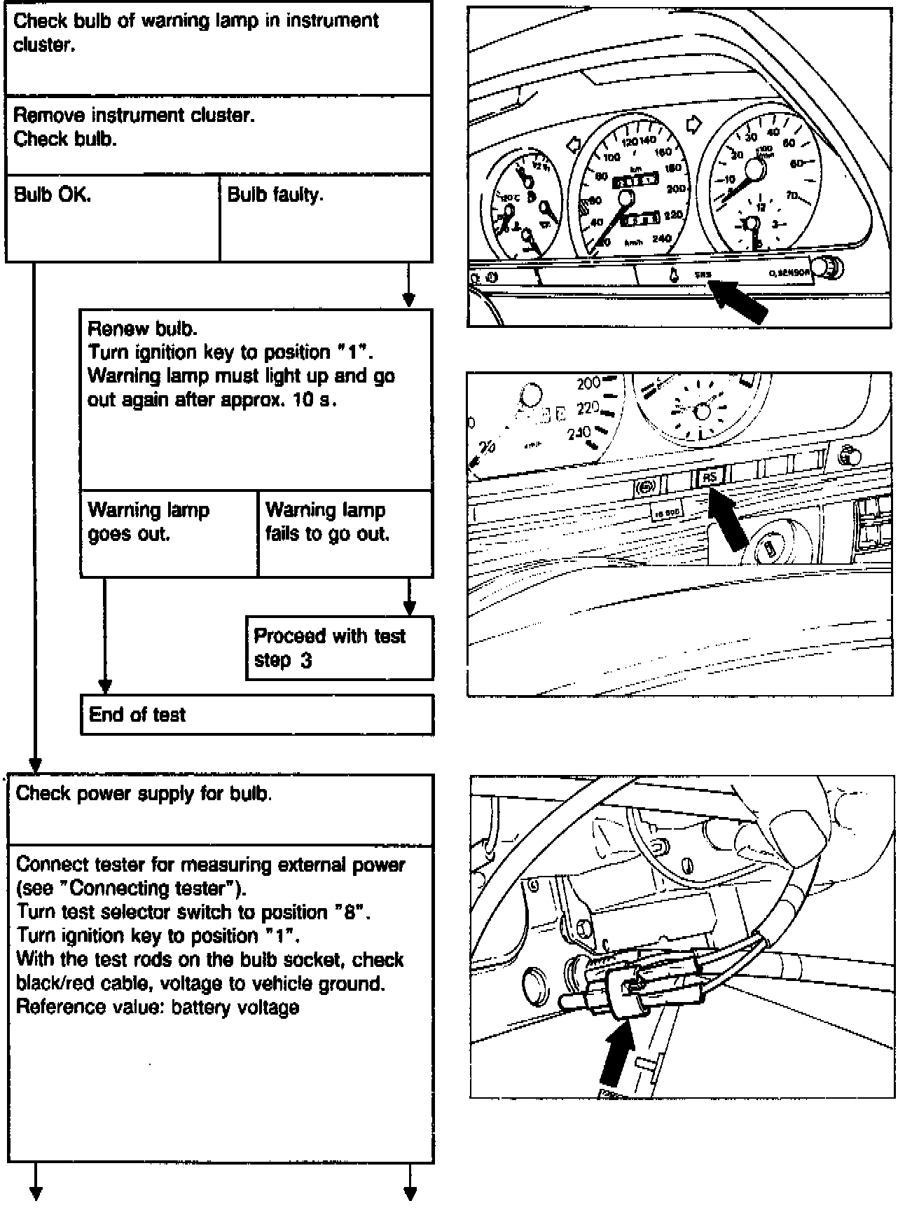 If, after turning the ignition key to position "1", the warning lamp lights up but fails to go out again within 10 s or flickers intermittently during driving, proceed as follows: