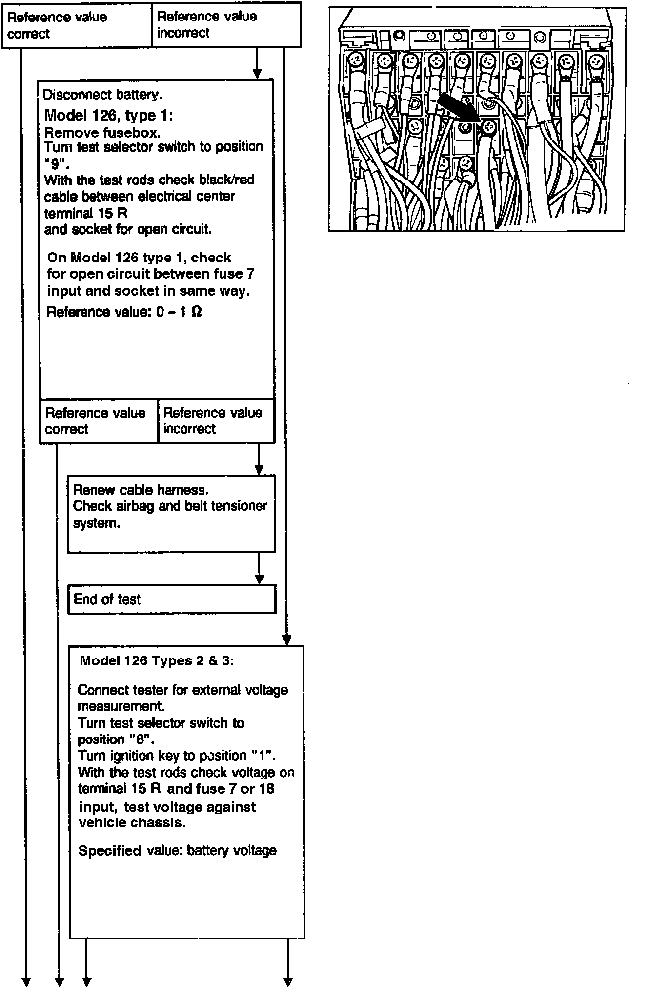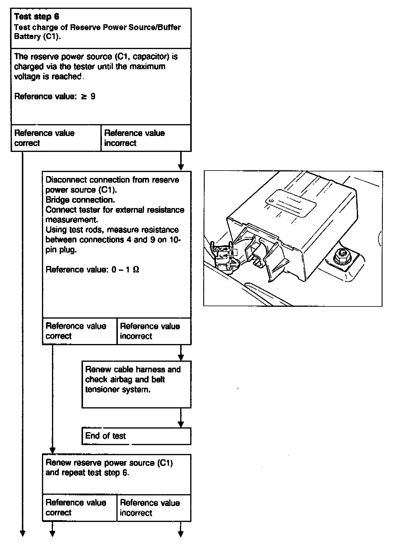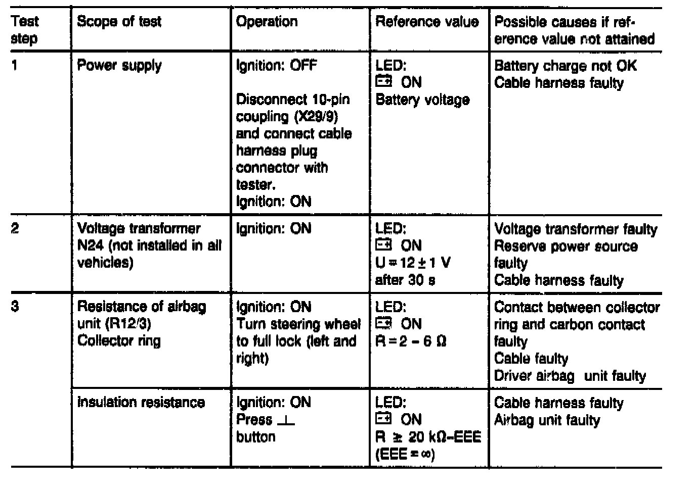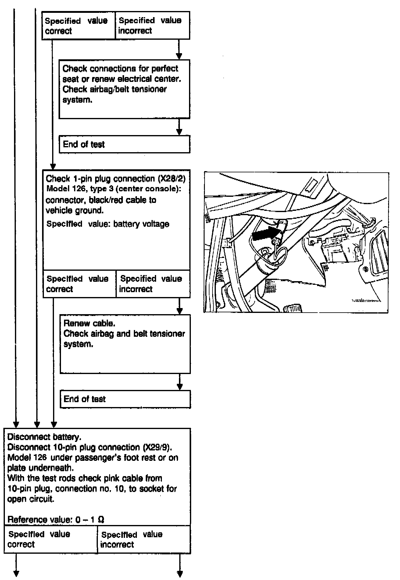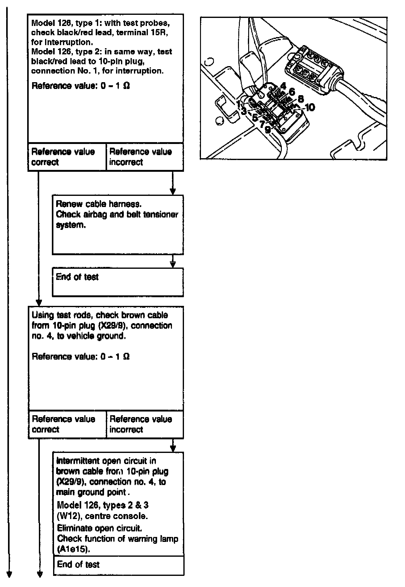 WARNING: Each time before disconnecting the red test coupling/plug connection for airbag, 10-pin (X29/9), to connect the tester, the ignition key must be turned to position "0", the negative terminal of the battery disconnected and covered. Then reconnect the battery for the test.