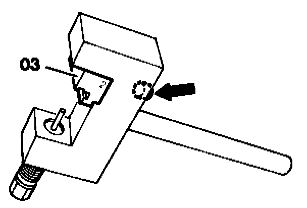 11. Insert thrust piece (03) as shown in drawing into the rivet tool and tighten with the screw (arrow).