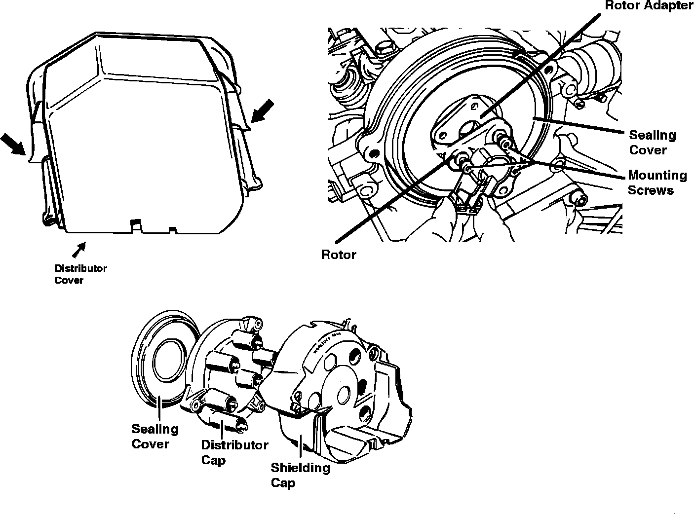 The ignition distributor's only function is to conduct high voltage from the coil through the ignition rotor to the proper ignition wire located on the distributor. It consists of the resistor rotor, the distributor cap and insulating cover (between the timing cover and ignition rotor). It is very flat and is mounted at the front of the engine. Each high tension terminal on the distributor cap incorporates a 1K ohm suppression resistor. The rotor is mounted on an adaptor which is driven by the camshaft.