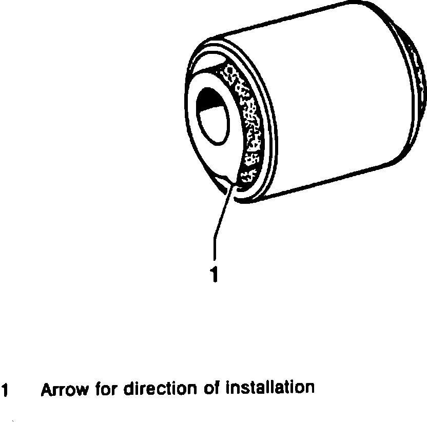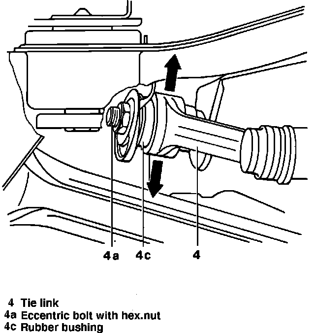 Toe angle is measure per wheel. Measure toe angle at normal vehicle height, then measure again with a spring deflection of approximately 2.4 inches. If toe angle is not within specified limits, an eccentric tie link rubber bushing with a center offset is available for adjustment, Figs. 1 and 2. Prior to removing the tie link bushing, mark position of eccentric bolt to rear axle carrier. To replace bushing with tie link installed on vehicle, use tool No. 124-589-02-43-00. To increase toe-in, install bushing with arrow facing downward. To decrease toe-in install bushing with arrow facing upward.
