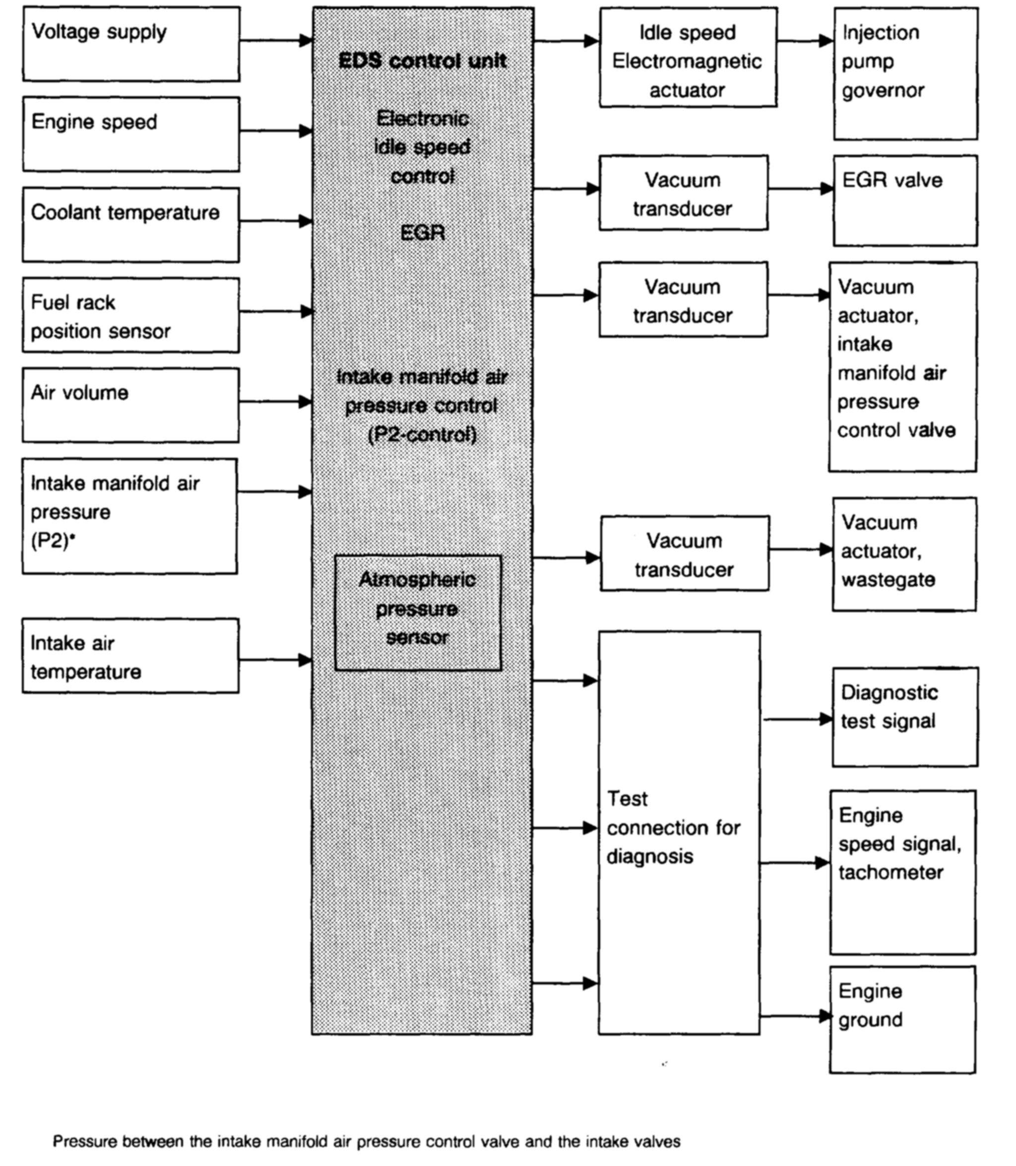 The EDS control unit processes the input signals and supplies a milliamp current to the vacuum transducers and to the electromagnetic actuator for idle speed control on the injection pump. Through additional terminals leading to a test connector, the entire system can be tested via blink code signals.