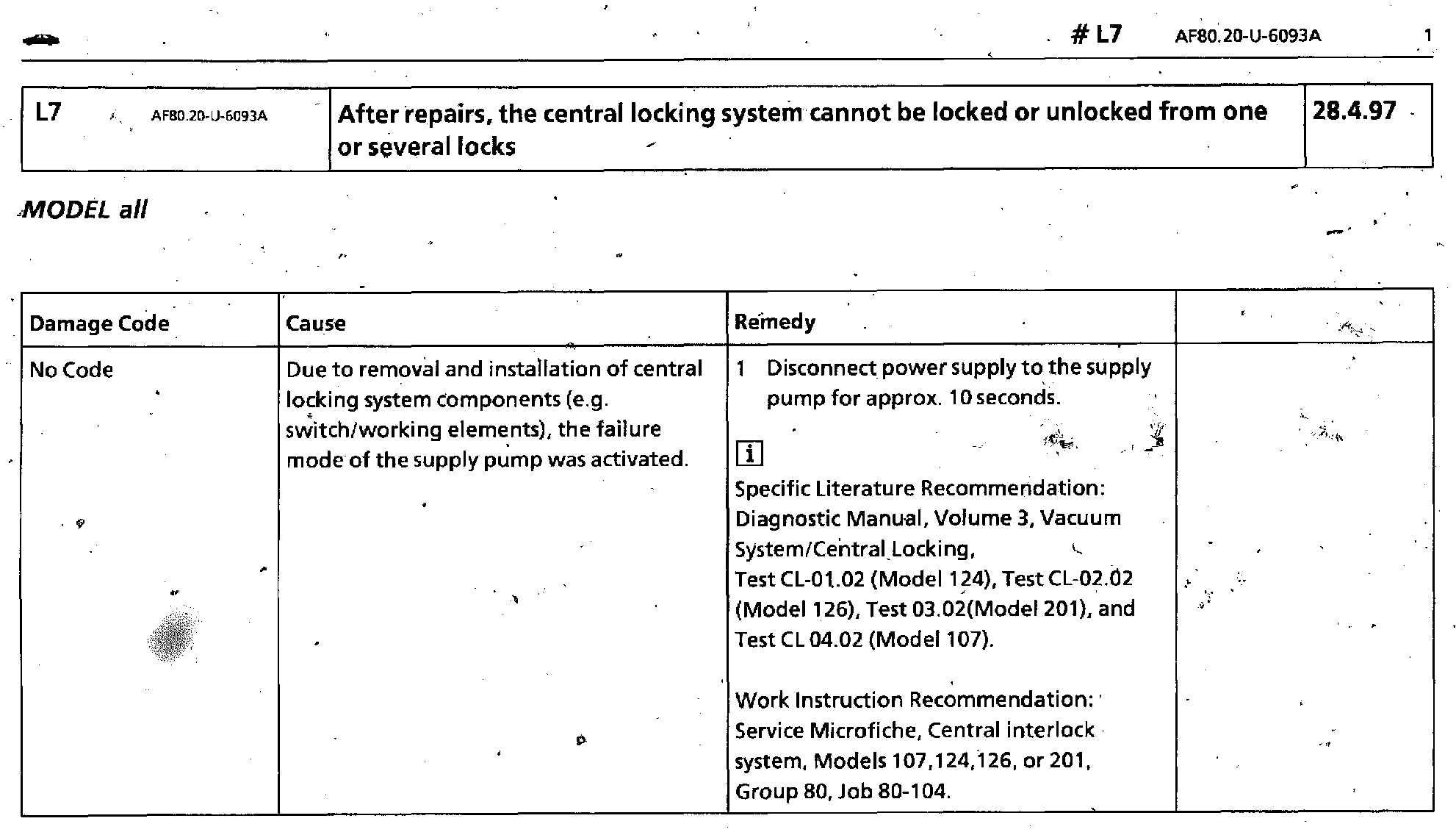 After Repairs Central Locking System is Inoperative