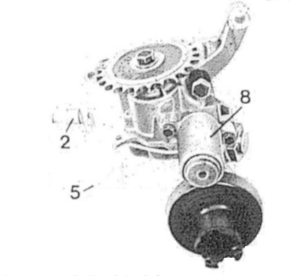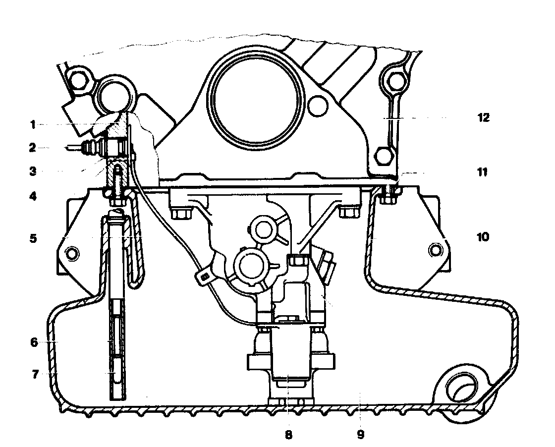 NOTE: The oil level transmitter (8) is bolted to the oil pump (9). The connection plug (2) of the connection cable (5) passes through a bore in the crankcase (1) from inside to the outside and is sealed with a sealing ring (4). On the outside the connection plug is attached with a locking ring (3).