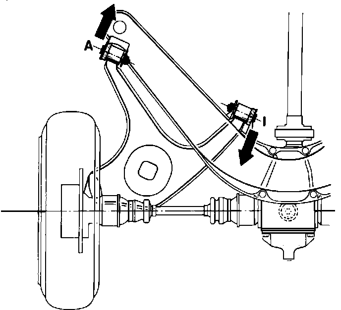 Toe angle can be corrected by the installation of eccentric rubber mounts in the semi-trailing arms. Semi-trailing arm eccentric rubber mount part No. 1233520765 is available to correct toe-in. To reduce toe-in, install outer rubber mount (A) with arrow pointing toward the rear as shown, Fig. 3, and inner rubber mount (1) pointing toward the front.