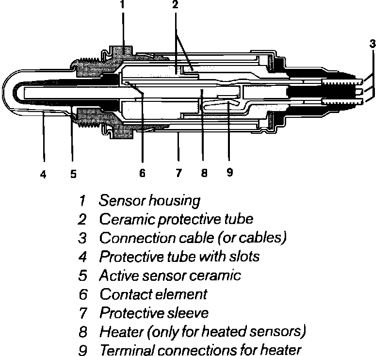An oxygen (Lambda) sensor located in the exhaust system upstream of the catalytic converter is used to provide more precise control of air/fuel mixtures. This system operates by measuring oxygen content in exhaust gases, as the amount of oxygen remaining in the exhaust gas is directly proportional to the air/fuel ratio of mixtures entering the engine. The sensor, mounted in the exhaust stream, reacts to the oxygen remaining in the exhaust gases and produces a variable voltage signal (0.4 - 1.0 vdc) depending upon the oxygen content.