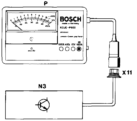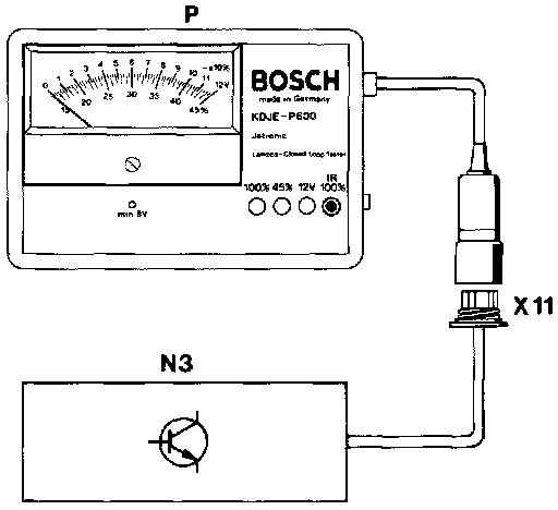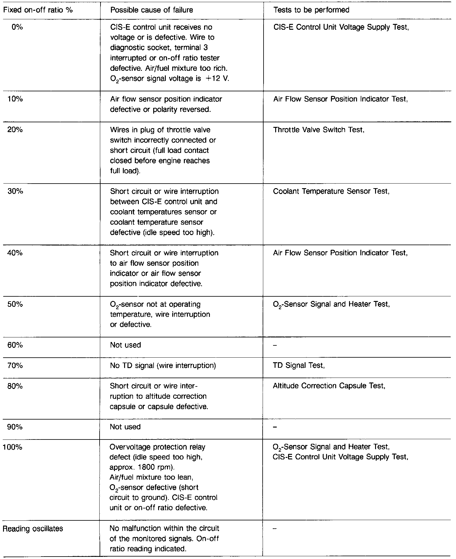 Various components of the CIS-E injection system are checked via the microprocessor in the CIS-E control unit. The failure codes are transmitted via the lambda measuring circuit of the diagnostic socket and are shown on the on-off ratio tester. The fixed on-off ratio indicates possible malfunctions. The following table lists the relationship between the fixed on-off ratio, the cause of the failure and the respective tests to be performed.
