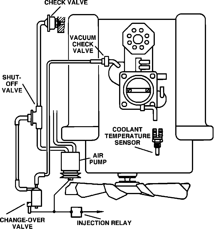 The Air Injection System pumps air from the air cleaner into the exhaust ports to promote oxidation of CO and HC. Additionally, the heat created by the oxidation process more quickly brings the catalytic converter to operating temperatures.