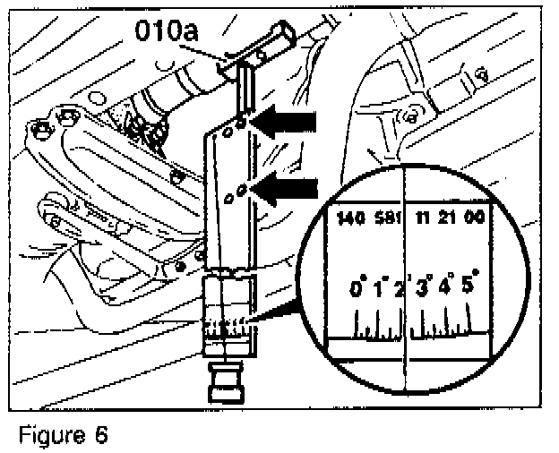 7. Attach protractor to the upper threaded bores of fixture 1, part no. 140 589 30 63 00 (arrows, Figure 6).