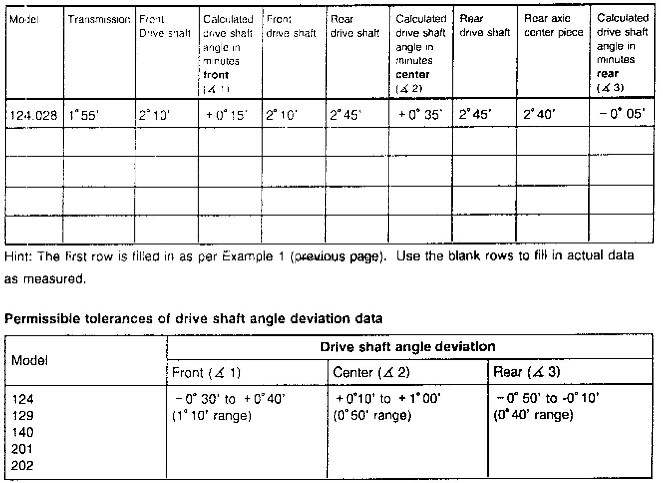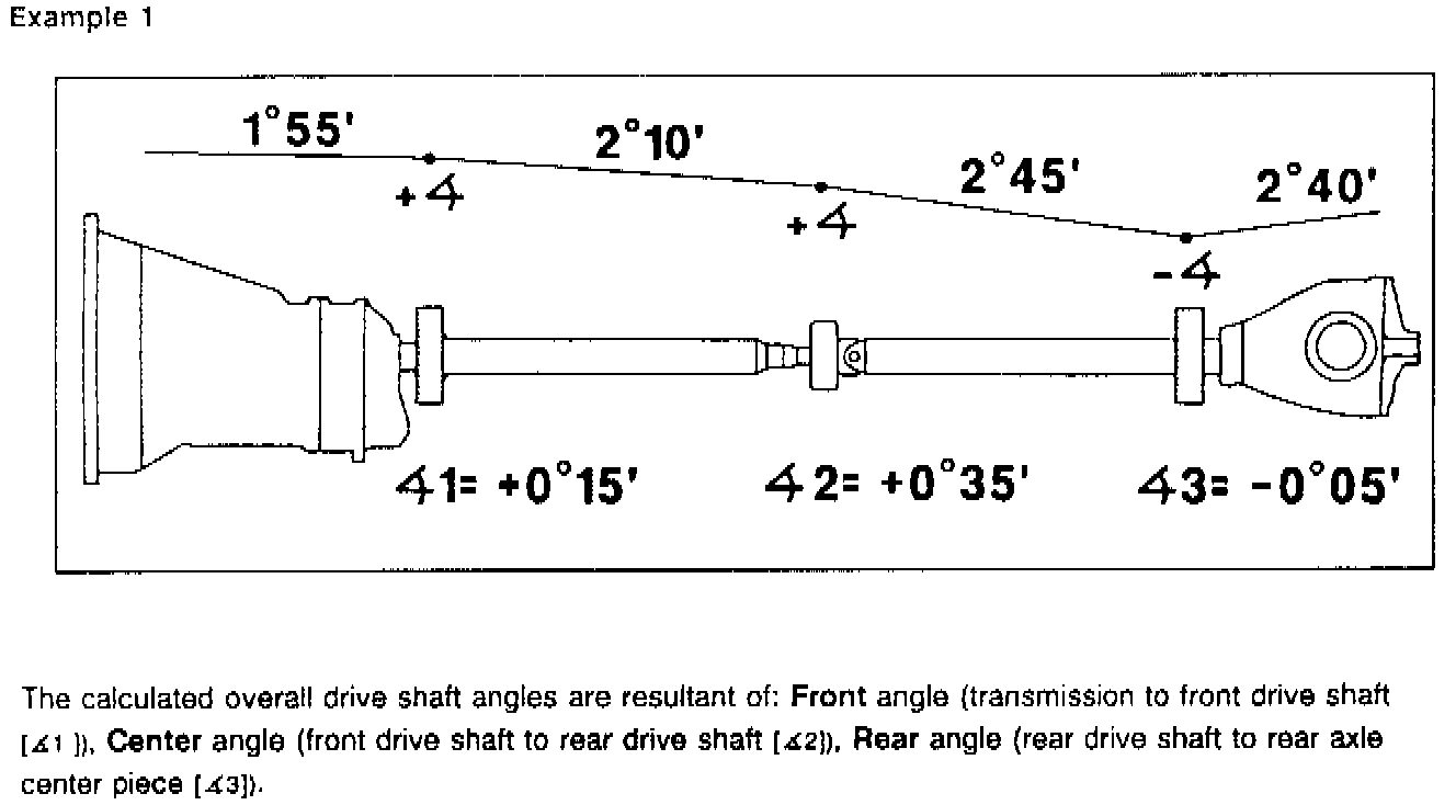 13. The calculated overall drive shaft angles (Example 1) indicate that the front and center angles are within the permissible tolerances. See Permissible tolerances of drive shaft angle deviation data.