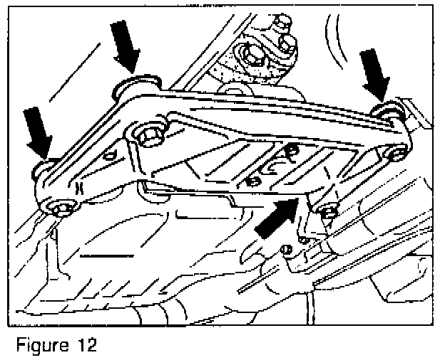 On model 124.034/036, the drive shaft angle is adjusted via 4 large chassis washers, part number 124 990 48 40, between the transmission cross- member and the frame floor (arrows, Figure 12).