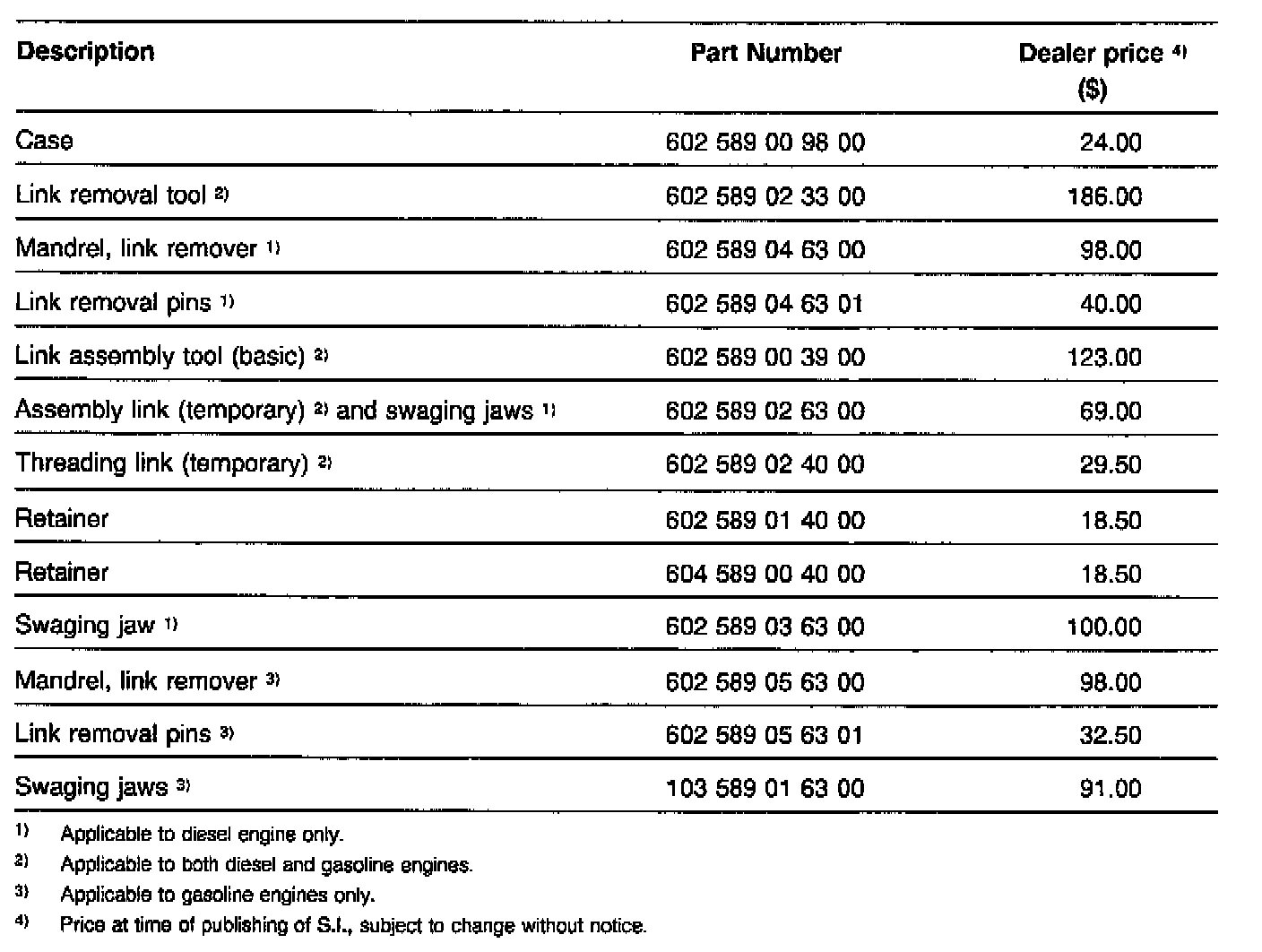 For gasoline engines, when replacing the single and double row timing chains, the following special tools are required: