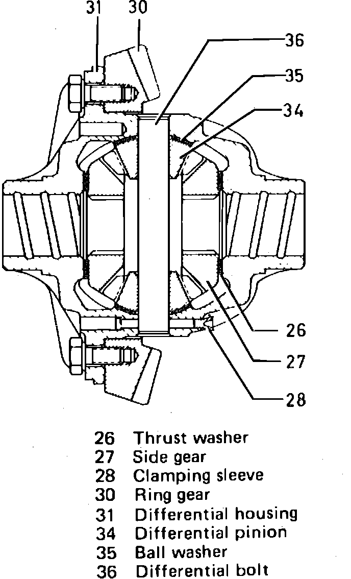 3. Vehicles equipped with first production model differentials, Fig. 1, using a suitable tool, knock out differential bolt (36) and sleeve (28) from differential housing (31).
