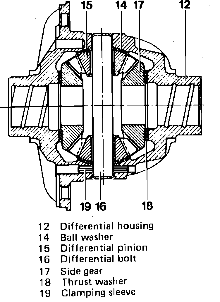 4. Vehicles equipped with second production model differentials, Fig. 2, remove differential bolt (16), pinion (15), side gears (17), thrust washer (18) and ball washer (14).
