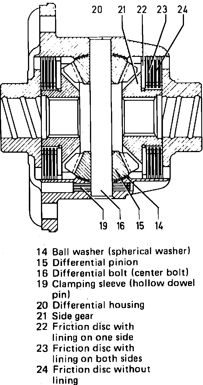 5. Vehicles equipped with positive traction differentials, Fig. 3, using a suitable tool, knock out differential bolt (16) and clamping sleeve (19) from differential housing (20). Remove right and left hand friction discs from differential housing.