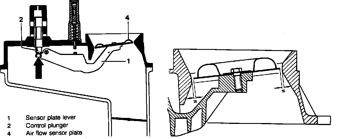 ^ The air-flow sensor plate upper edge must stand flush with the upper edge of the cylindrical part of the air funnel. A higher position of up to 0.008 in. (0.2mm) is permissible. Adjust the zero point if necessary.