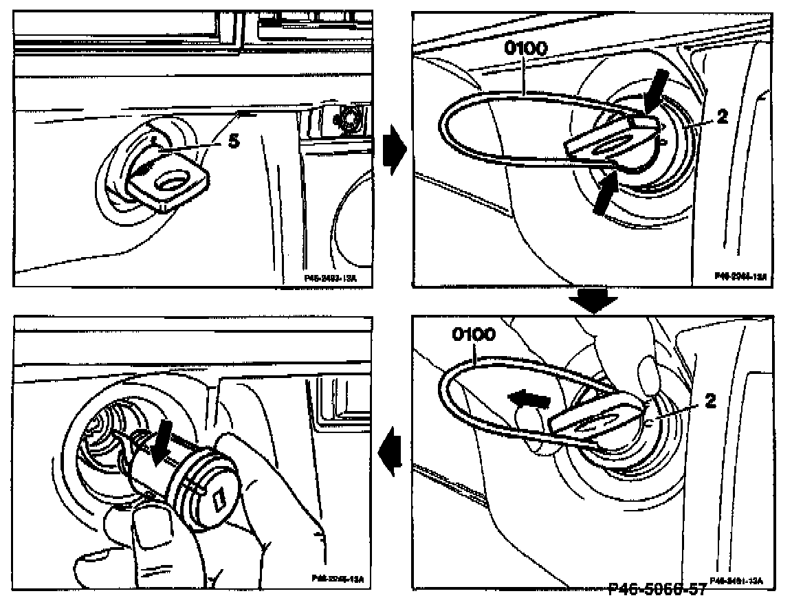 3. Remove lock cylinder (5) from steering wheel lock together with cover (2). Pull release wire (0100) out of lock cylinder(5), turn ignition key to position "0" and remove.