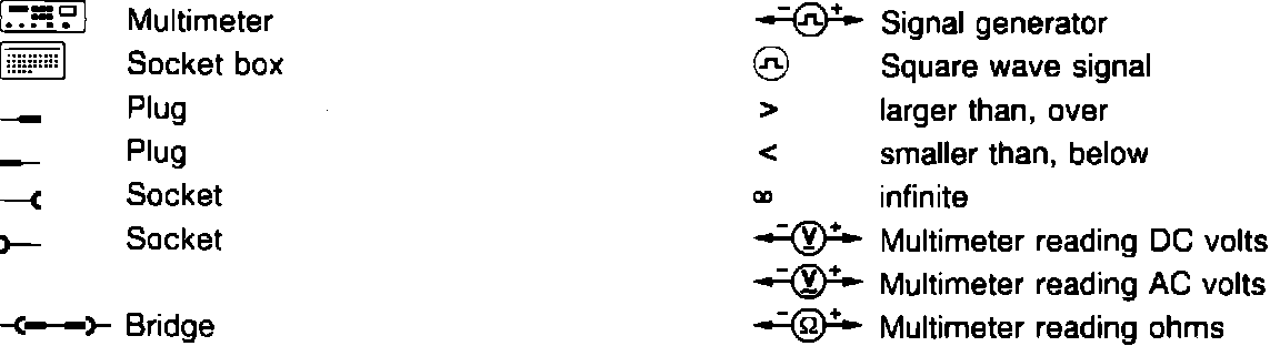 Using the proper test equipment the tests start at Test step 1. Scope of the test is the circuit being tested. Test equipment/test connection refers to the tester and terminals to be used for that specific test. Test condition is the state of the ignition system and action required to initiate test. Nominal value and Possible cause/remedy are the desired result and the action to take if not correct. Use the images above for symbol identification.