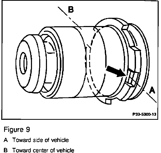 8. Coat hydraulic bushing with a thin layer of installation lubricant, part no. 001 989 14 51, and install into control arm with the offset indentation (arrows, Figures 9 and 10) horizontally aligned with the welding seam of the control arm, pointing toward the ball joint/outside of the vehicle (A, Figure 10).