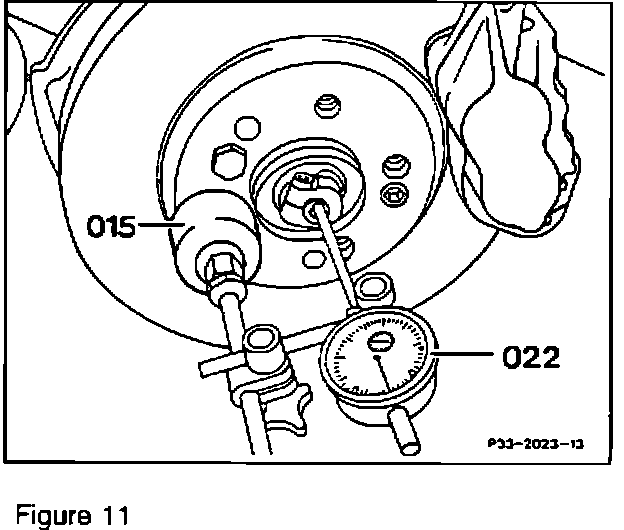 10. After installation of the hydraulic bushings and reinstallation of the control arms and springs, adjust the wheel bearing play to 0.01 mm (see SMS Job No. 33-0300) and then check and, if necessary, adjust the vehicle's front wheel alignment (see SMS Job No. 40-0320. For newest front wheel alignment data, see S.I. 40/115, June 1992).