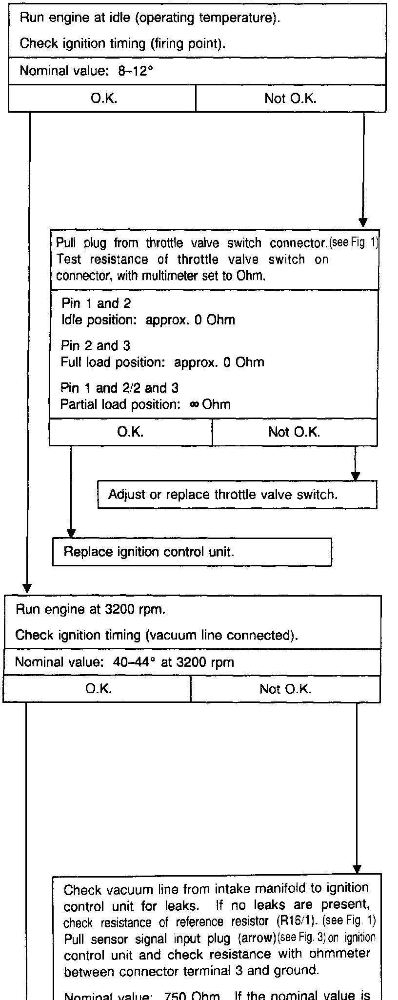 The basic functions of the ignition system are in order, but a fault in ignition adjustment is suspected. The faults may be caused by the coolant temperature sensor or by the ignition control unit itself. They cannot be evaluated using driving performance since this type of ignition control influences only the emission characteristics and the fuel consumption data.