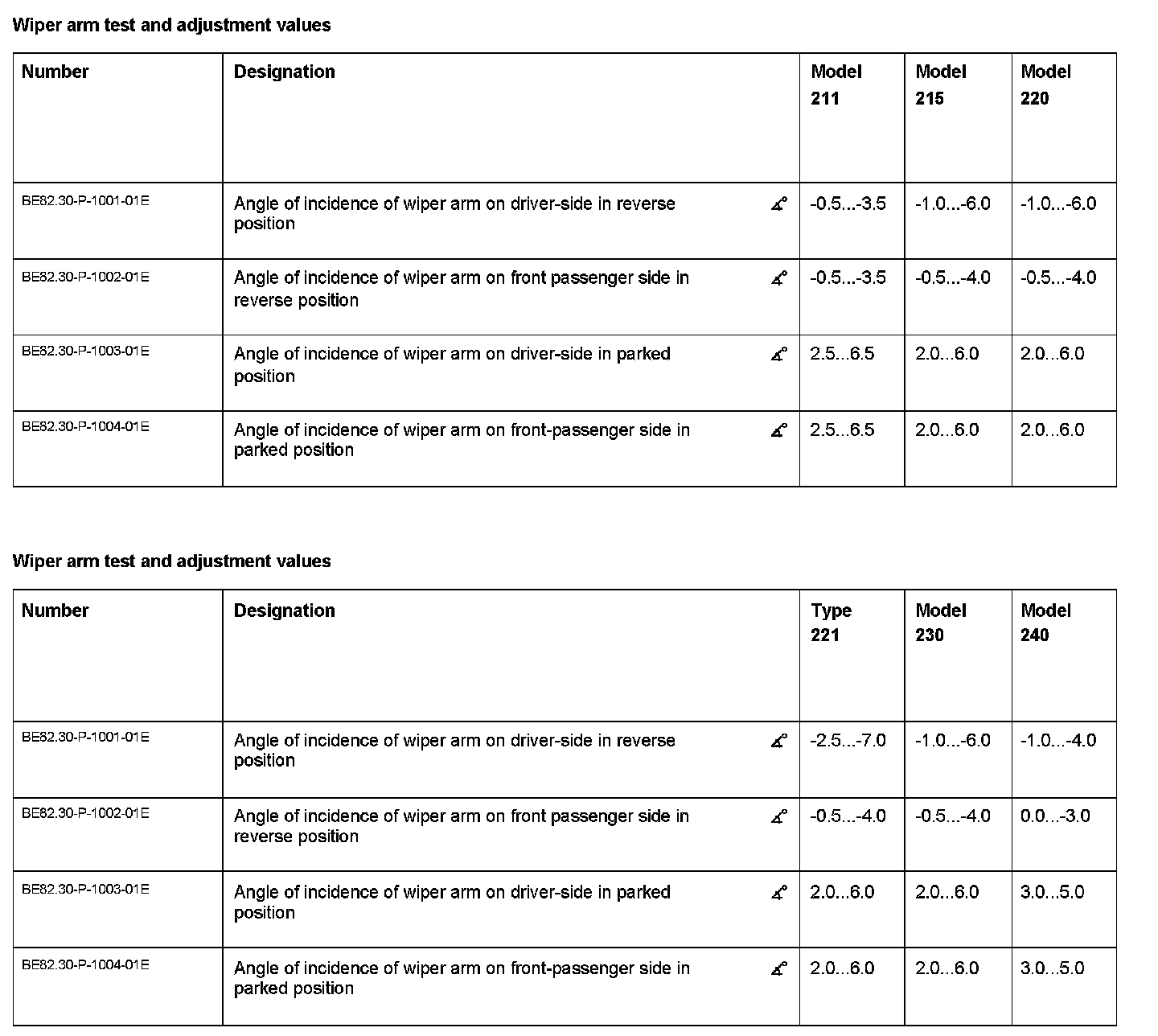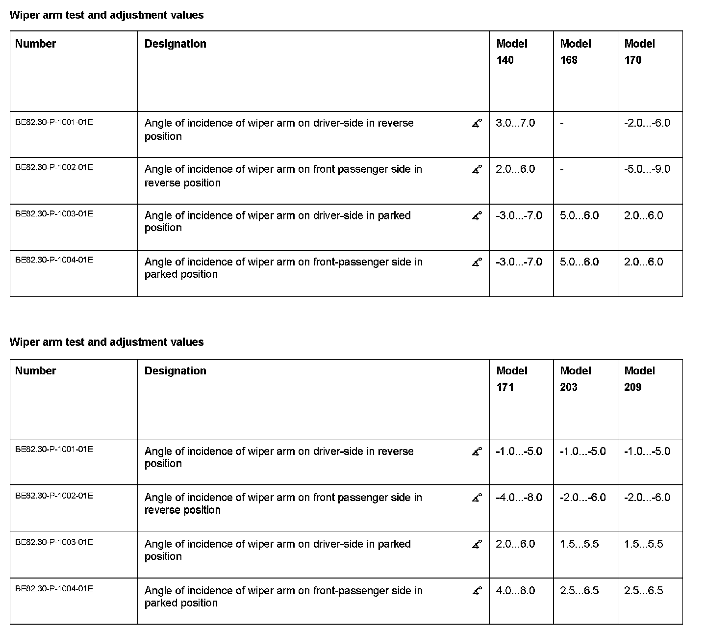BE82.30-P-1000-01E Adjustment Values For Windshield Wiper