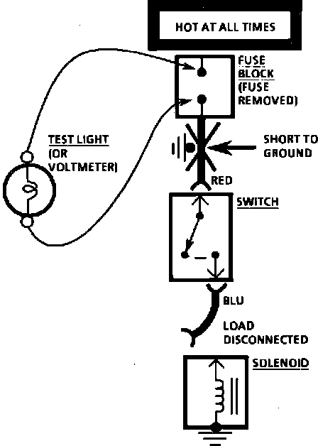 ^ If the fuse blows, the short is in the wiring leading to the first connector or switch. Use a test light or meter as described previously.