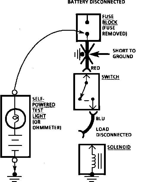 5. When the self-powered test light glows, or the ohmmeter registers, there is a short to ground in the wiring near that point.
