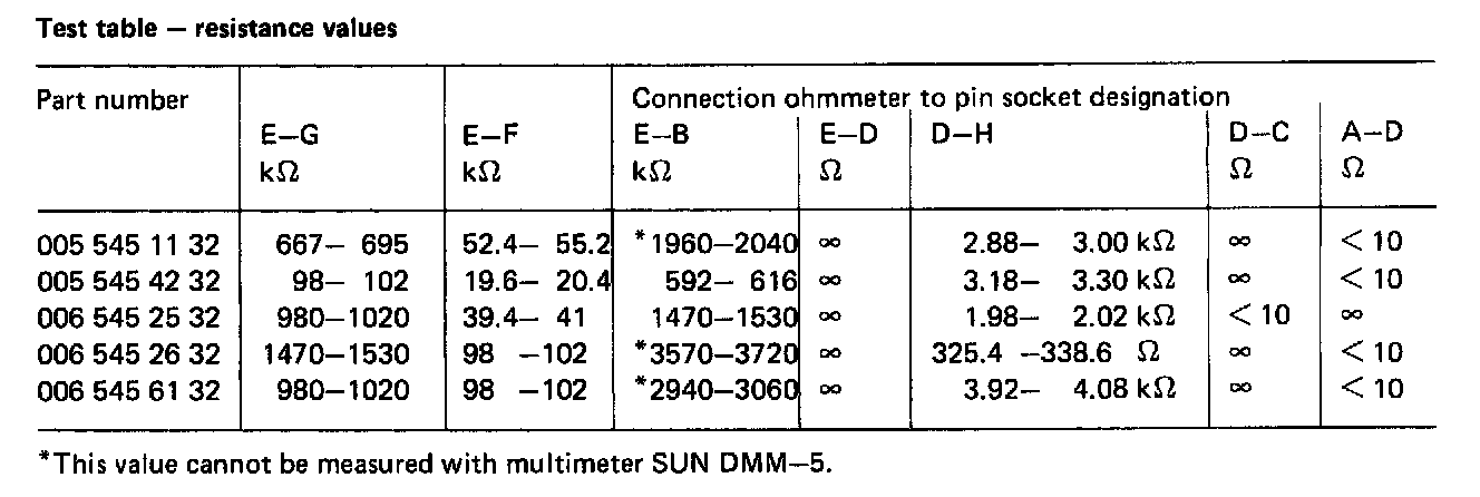 Connect ohmmeter and check resistance values (refer to table), renew coding plug (R 29) if values are deviating.