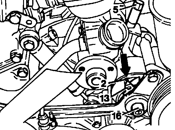 3. Turn tensioning nut (5) to the right until the pointer (13) is aligned with the marking (2, arrow).