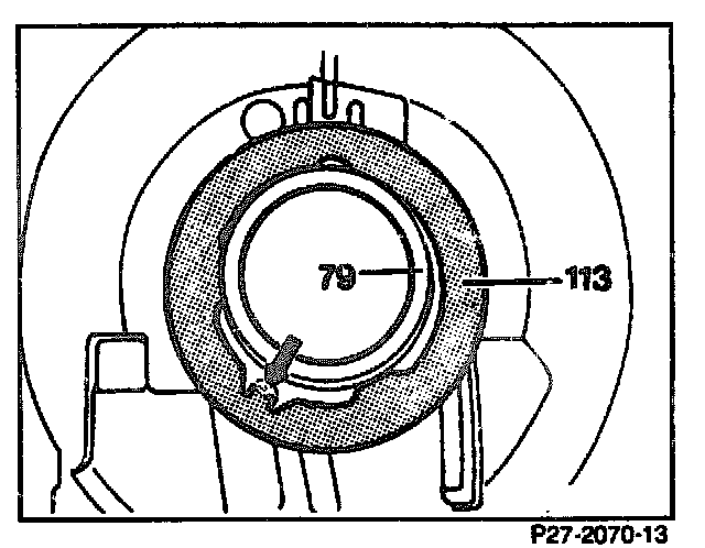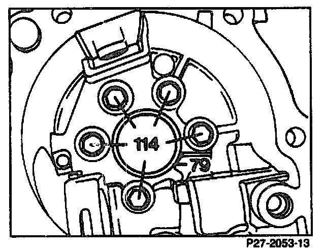 48. Unscrew hex bolts (114). Opposite this, screw in two bolts approx. 80 mm long. Detach the supporting flange (79) from housing by means of hammer blows on the two bolts.