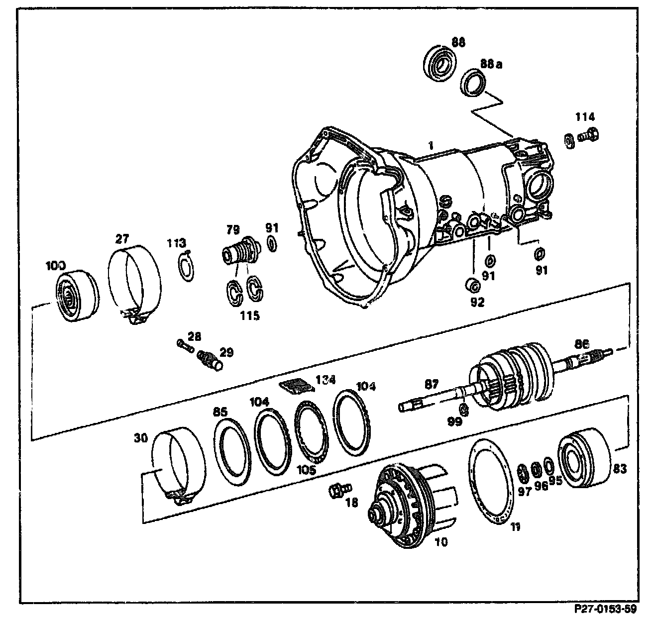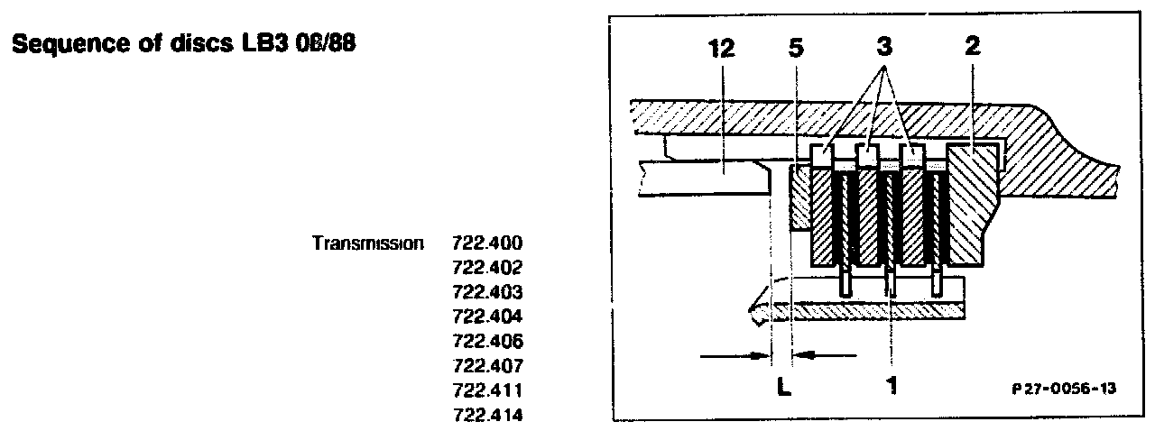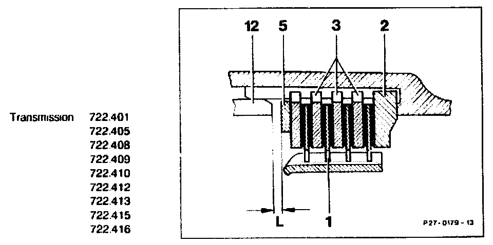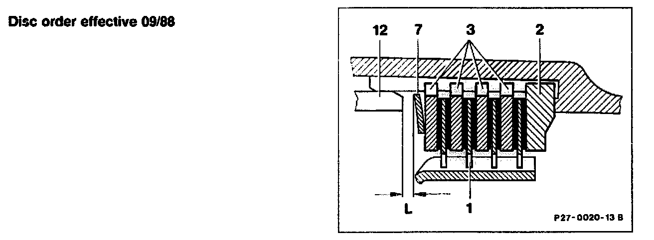 Remove complete. When installing, set play "L" of multi-disc brake B3 to 1.5 - 2.0 mm. Do this by inserting discs (104, 105) and Belleville spring washer (85).