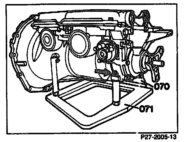 4. Bolt mounting plate (071) to assembly pedestal (070). Insert transmission into mounting plate and fix with bolt (arrow).