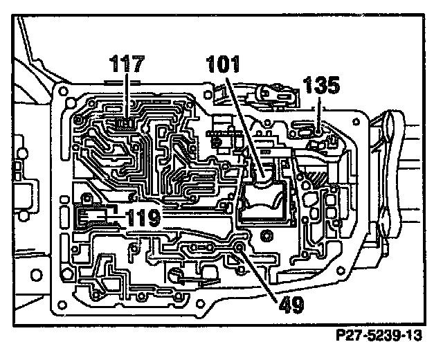 10. Remove one way valve (49), brake band guide B2 (101), locating pin (135), temperature restrictor (117) and oil defector piece (119).