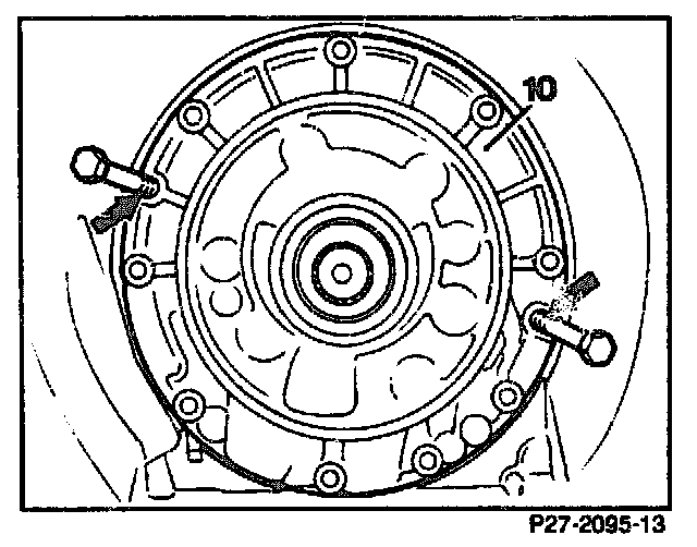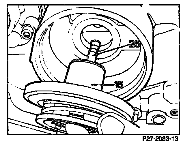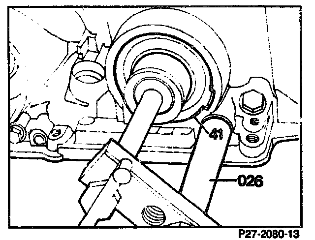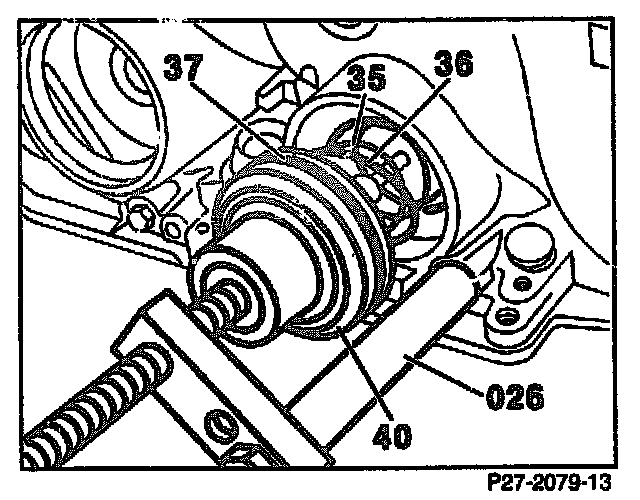 13. Fit on assembly device (026), bolt to transmission housing and tension.
